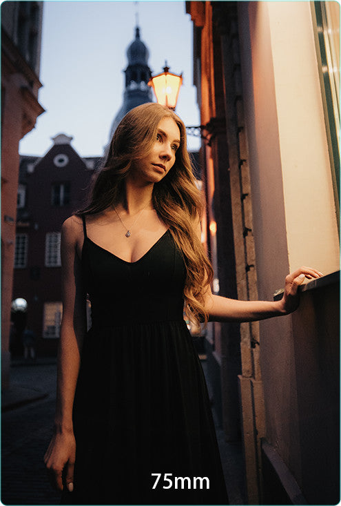 Equivalent to a 50mm full frame lens, suitable for almost all shooting situations, such as portrait, food, still life, posing, etc.