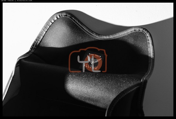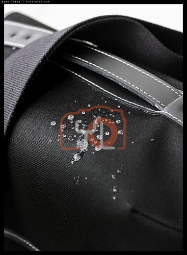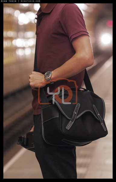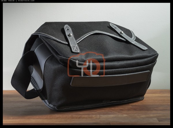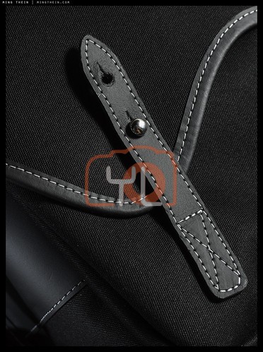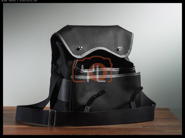 - Materials: Double layer water-repellant canvas, Italian calf leather, black/black with grey stitching. Handle in leather, cotton webbing adjustable shoulder strap. Leather ball-and-tab front closure with two positions.