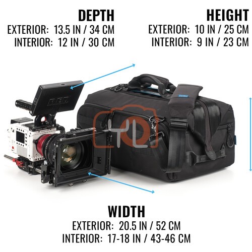 The 32L Cineluxe V2 Shoulder Bag 21 in black from Tenba accommodates mirrorless, DSLR, or cinema camera rigs up to 18" long, plus attached accessories. The height and length measurements allow you to store your camera rig with baseplate, matte box, monitor, and mic attached, so you're ready to shoot when you arrive at your destination. It features a doctor bag-style opening down the middle for easy access to stored gear and maintaining the bag's footprint when opened.