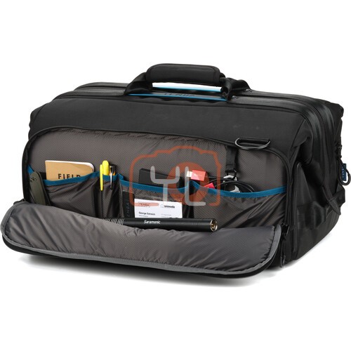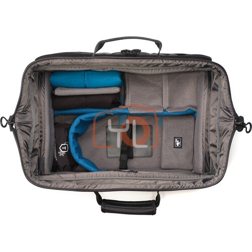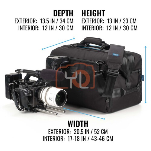 The 42L Cineluxe V2 Shoulder Bag 21 Hightop in black from Tenba accommodates mirrorless, DSLR, or cinema camera rigs up to 18" long, plus attached accessories. The 12" interior height of the 21 Hightop allows you to carry your camera rig with baseplate, matte box, monitor, and mic attached, so you're ready to shoot when you arrive at your destination. It features a doctor bag-style opening down the middle for easy access to stored gear and maintaining the bag's footprint when opened.