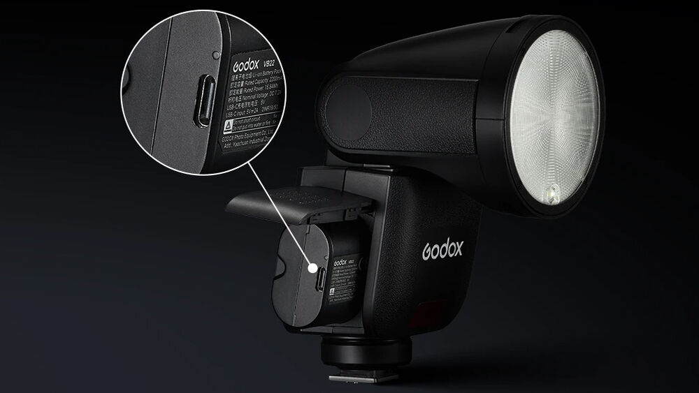 Powered by an included 7.2V, 2200mAh lithium rechargeable battery and providing a recycle time of 1.7 seconds, the V1mid N allows 650 full-power flashes and flash duration between 1/600 and 1/20,000 sec. Another highlight is a built-in 2W LED modeling lamp with 5300K (+/-200K) color temperature and adjustable brightness (1-10). Battery indicators on the display panel inform you of the remaining battery level. Here, Godox includes the USB-C charging cable and adapter in the box.