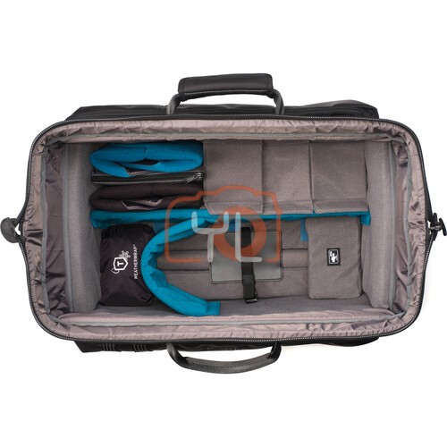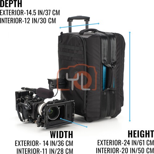 The 43L Cineluxe V2 Roller 21 in black from Tenba accommodates compact mirrorless, DSLR, or cinema cameras up to 20" long, plus assembled accessories. The bag has built-in wheels and a retractable handle for easy transport to set. The interior depth matches the depth in the shoulder bag and backpack models. It features a doctor bag-style opening down the middle for easy access to stored gear and maintaining the bag's footprint when opened.