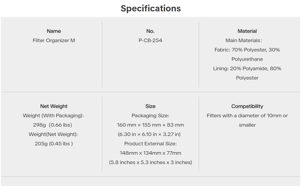 Protect your filters from scratches while traveling with the Filter Organizer from PGYTECH. Providing both durability and convenience, this palm-sized case features a splash-repellent surface and a dependable YKK zipper. Additionally, there's a loop strap on the top of the Filter Organizer, allowing handheld carrying and the ability to hang onto the bottom of your tripod or onto your backpack. The inside fits up to seven filters and is made with scratch-resistant microfiber to prevent any damage. Each filter separator features a unique color-coded label for quickly identifying your filters.
