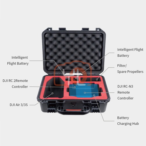 The interior compartments of this case can hold the following items:- DJI Air 3 or Air 3S drone with battery