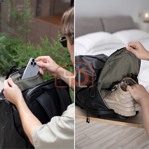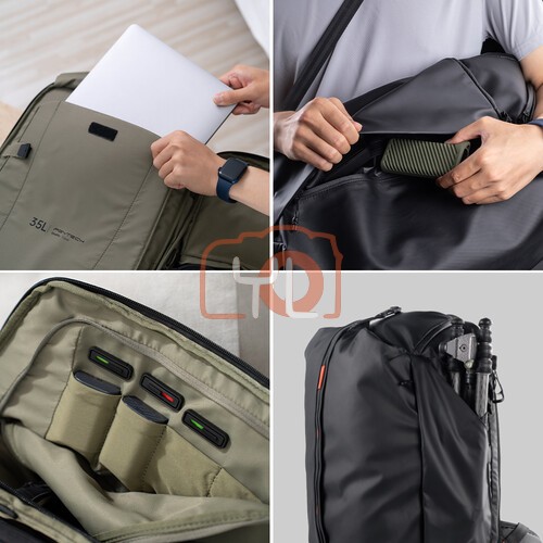 Carry your personal items while commuting or traveling in the 35L OneMmo Travel Backpack in Olive Green from PGYTECH. The front compartment expands up to 15L to offer a total maximum capacity of 50L, making it ideal for large or bulky items. It is made from water-resistant polyester and has durable YKK zippers. The waist belt can be removed and used as a shoulder strap for cross-body carrying, or use the handles to carry it like a duffel. A designated laptop pocket can fit devices or notebooks up to 16". This pack has straps to secure a camera insert or a clothes storage set, which are not included. A zippered, flexible divider can be used to separate your items in your pack for enhanced organization.
