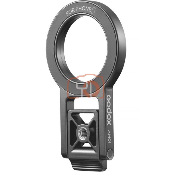 Powerful dual-sided N52-grade magnets in the Magnetic Bracket for MA5R from Godox let you securely mount Godox MA5R, magnetically compatible smartphone, or any other device or accessory with the included magnetic ring. The bracket's base can be mounted on a tripod or directly to a phone cage or camera via cold shoe. The pivoting bracket lets you tilt your magnetically attached device to the perfect position. It's an ideal solution for illuminating your subject with an LED light, filming social media-friendly content on a phone as you shoot with your camera, or pairing it with a tripod to create a vlogging station.
