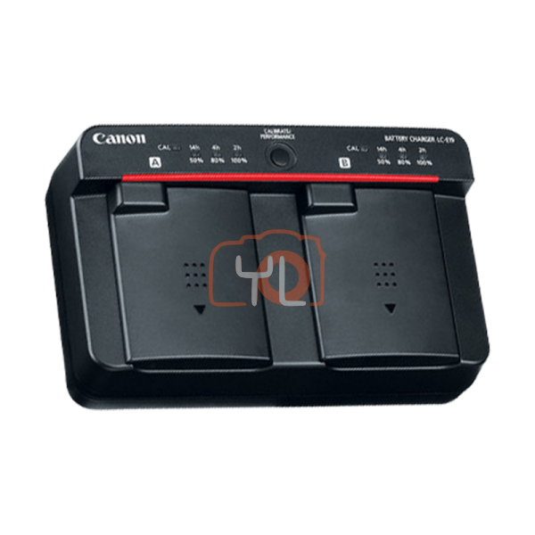 The LC-E19E Battery Charger from Canon will charge two separate LP-E19, LP-E4, or LP-E4N battery packs. LP-E19 batteries charge at a rate of 170 minutes per battery, while LP-E4 and LP-E4N charge at a rate of 140 minutes per battery. It plugs directly into AC outlets and includes an AC adapter.