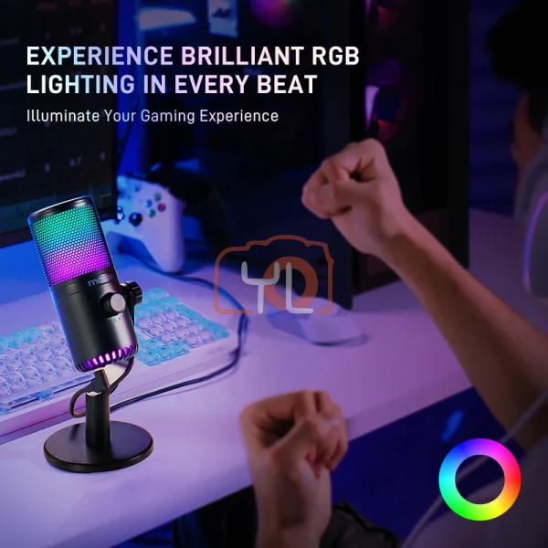 Programmable RGB Lighting — Multiple static & dynamic RGB effects; customizable via onboard controls or Maono Link software — enhances your desktop setup aesthetics.